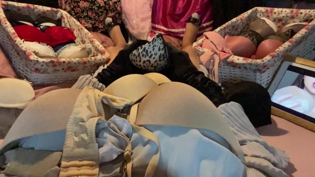 MASTURBATION OF TRANSVESTITE WITH BRA ON, SNIFFING BRAS, FUCKING BRAS & CUM IN BRA POV 4