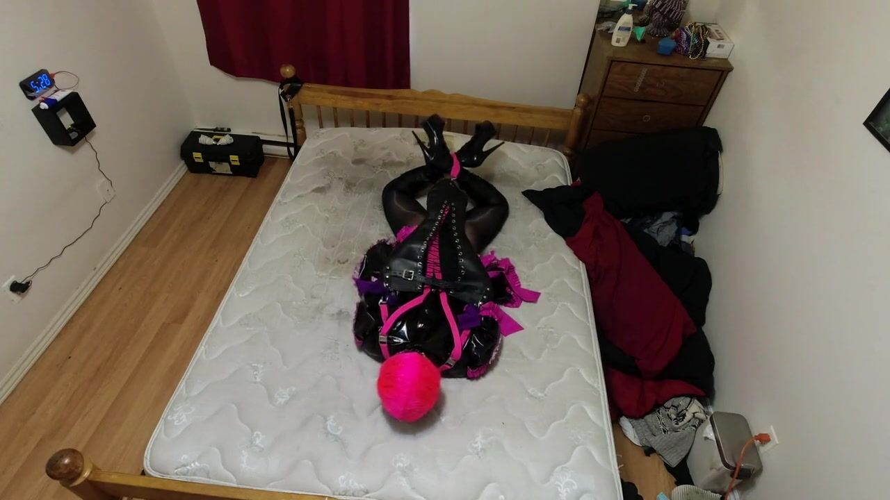 . another self bondage hogtie with the armbinder and strapped ankles, but with ice cubes in socks instead of icelocks.. chastity belt locked on with large dildo in place. gagged .. mmmmmmmph