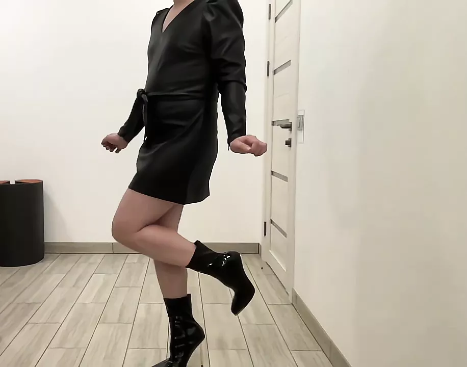. My perfect new leather short dress and ankle boots on high heels. I want you to suck my big cock and to lick my tranny asshole. Then you will buy me another dress and I will cum onto your face