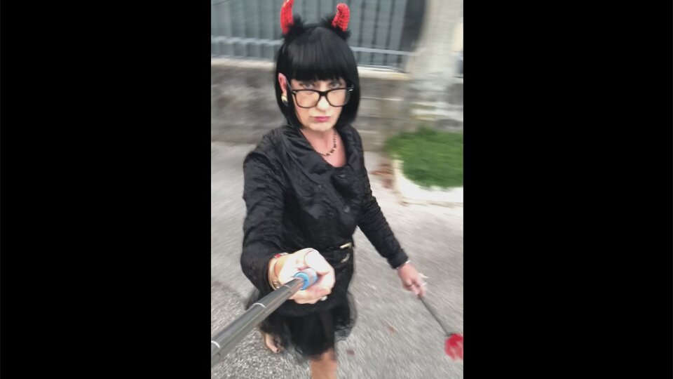 . Little devil Andreina walks in the park showing two voyeurs her caged clit