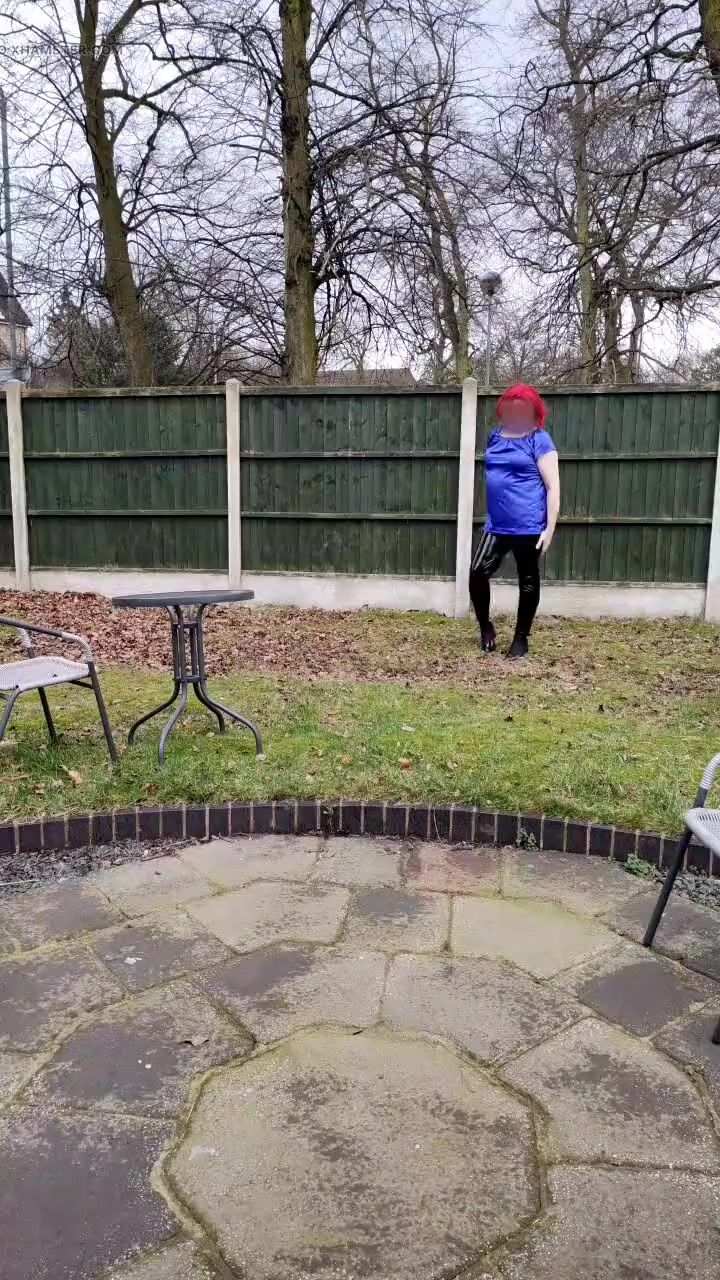 TV CUMSLUT NOTTSTVSLUT IN THE GARDEN SATIN BLOUSE AND TIGHT PVC LEGGINGS