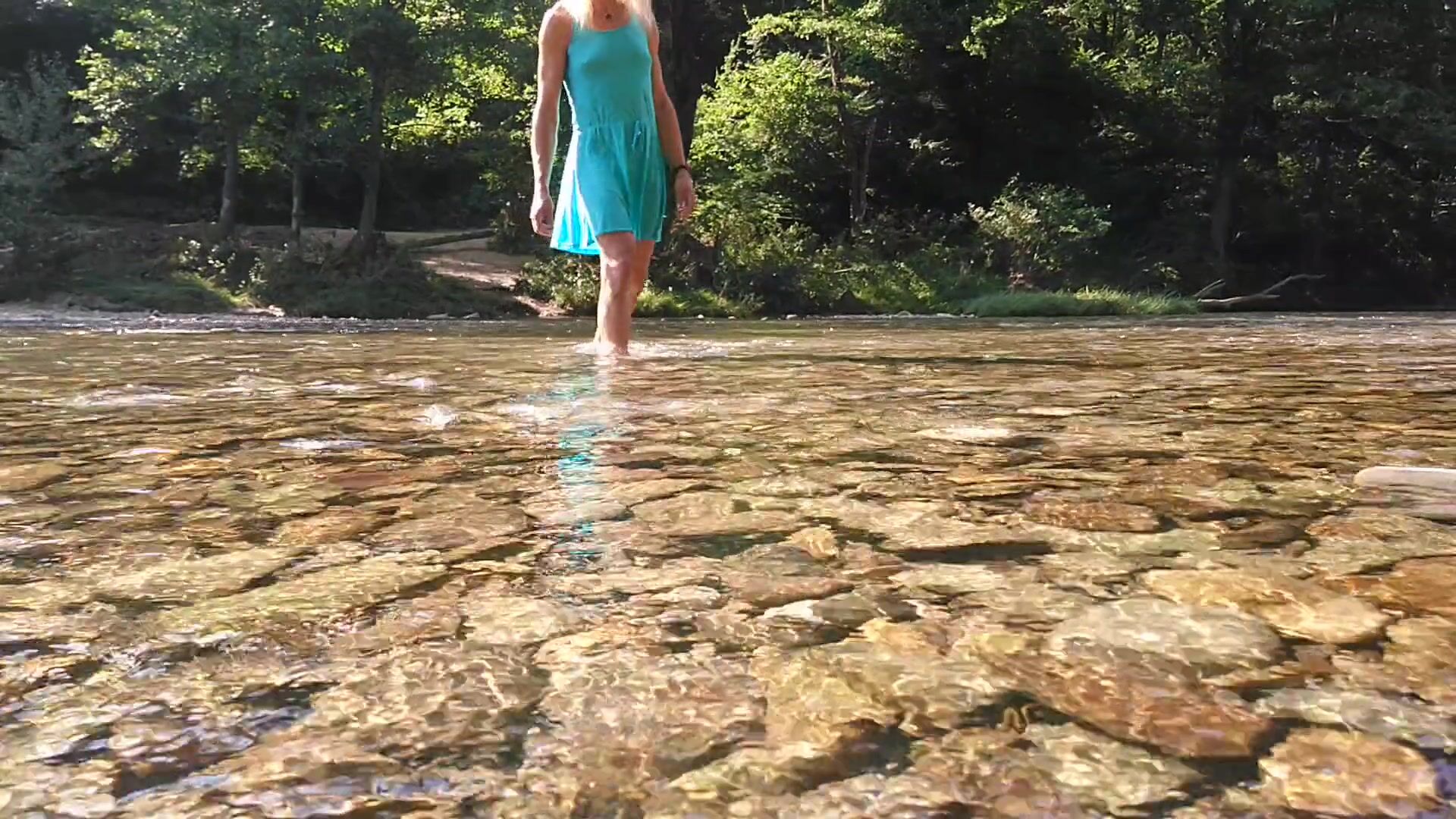 SEXY T-GIRL SWIMMING IN MOUNTAIN RIVER AND WETTING TEAL SUMMER DRESS ...