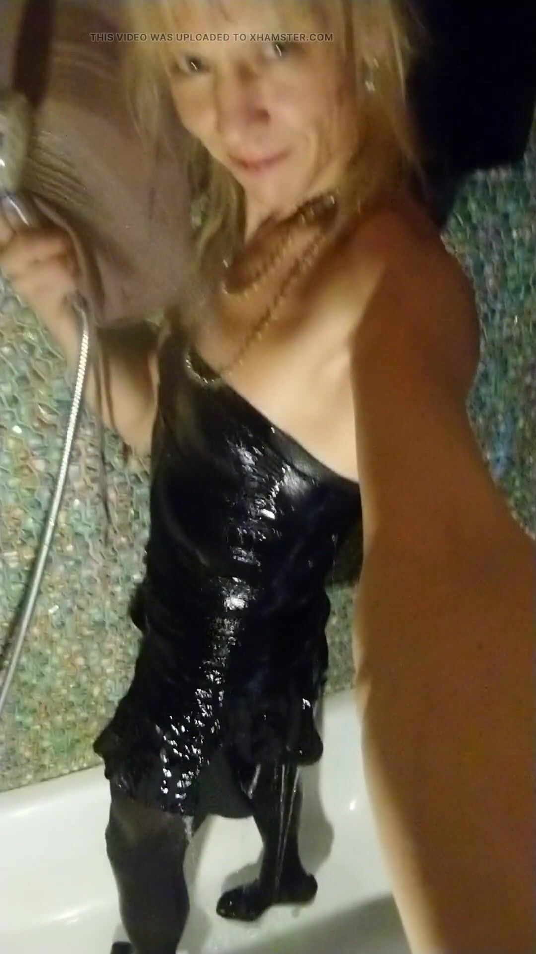 WETLOOK TRANSGIRL IN BATHROOM WEARING IN BLACK DRESS, SKIRT, PANTYHOSE AND HIGH HEELS