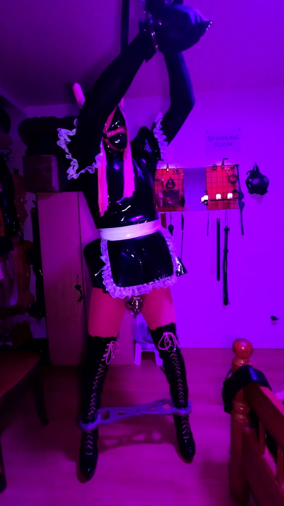SISSY MAID CUFFED IN LEATHER MITTS - SELF BONDAGE