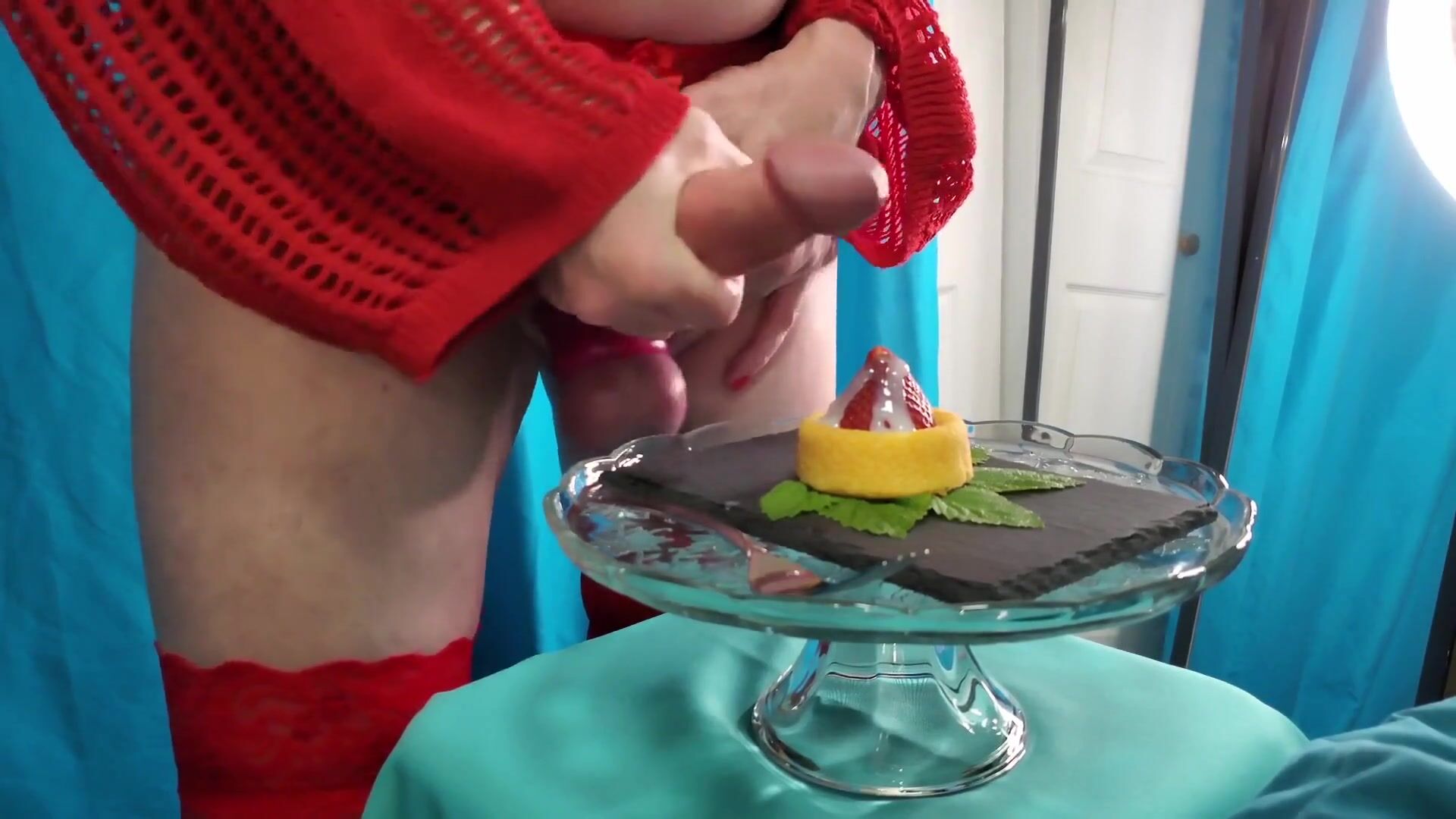. Enjoying a little decadent dessert of strawberry shortcake with fresh, hot cream straight from my smooth, swollen balls. A little cum leaking and a ruined orgasm give me the perfect topping!