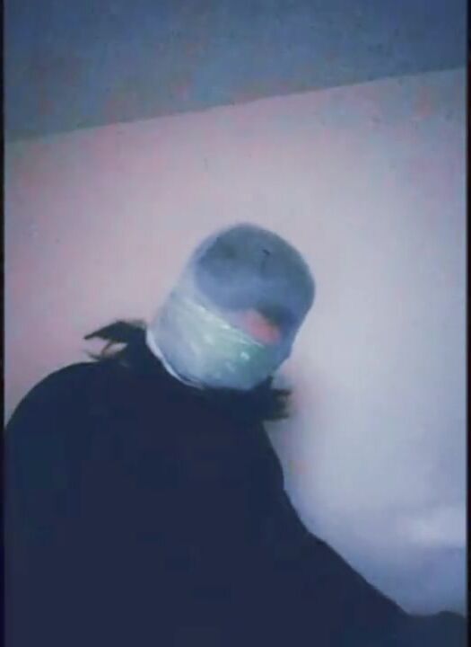 . stuffing her mouth with bandanas, then she gagged and after putting the stocking on her head, she wrapped the bandanna around her again