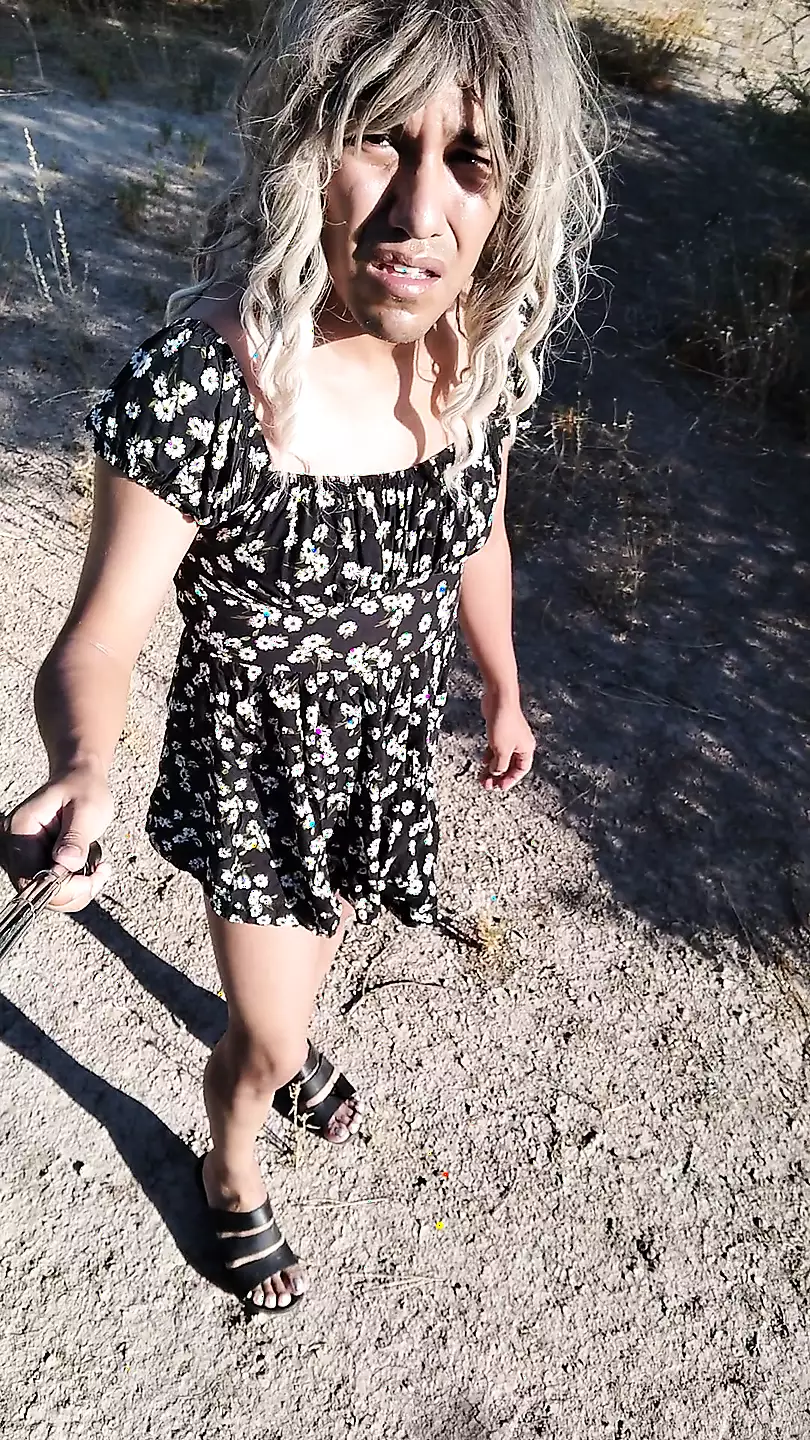 . Beautiful ladyboy in mini dress and sandals walks in very hot